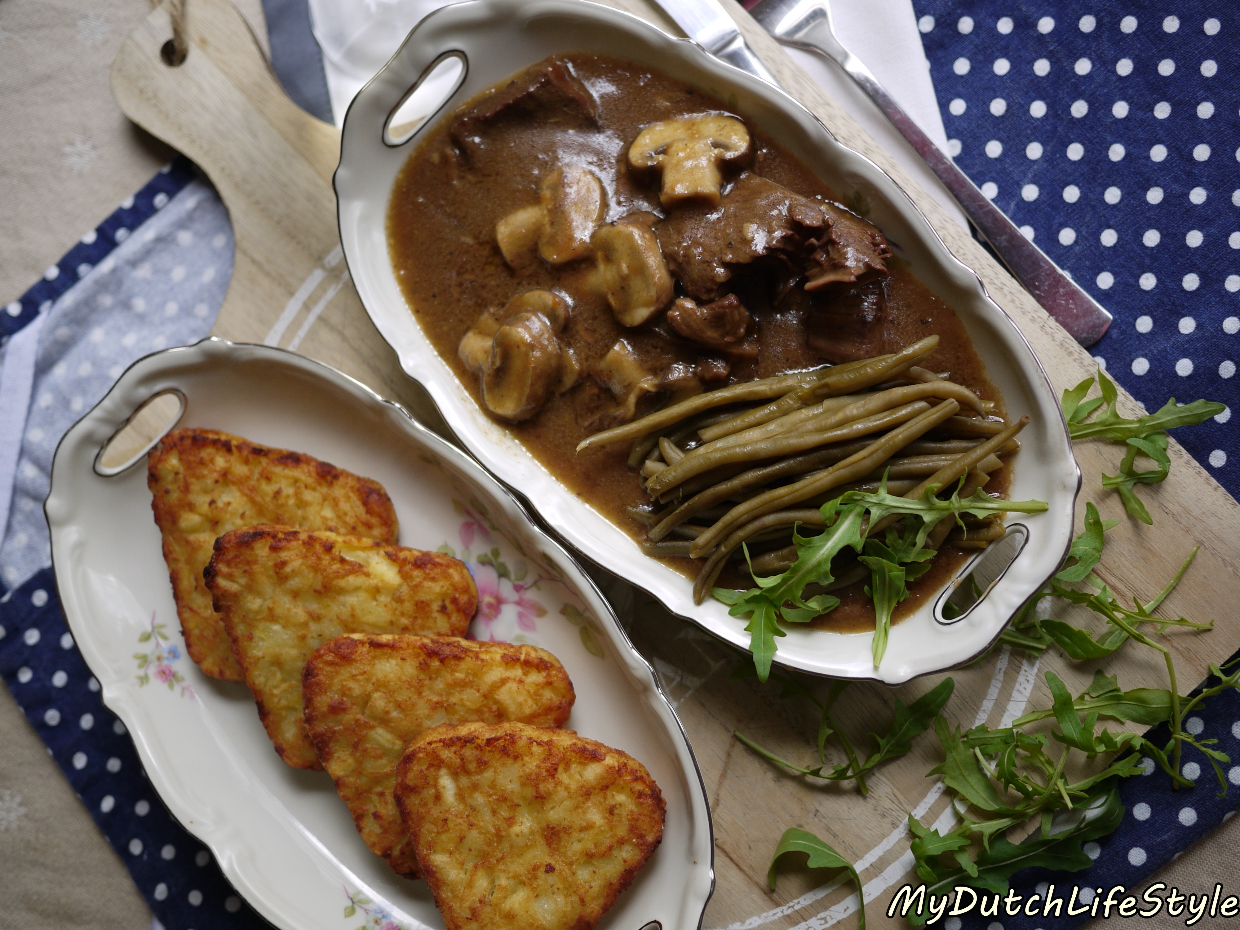 食材:美國牛肋條、高筋麵粉、橄欖油、西洋芹、洋蔥、紅蘿蔔、蒜末、蕃茄、濃縮蕃茄醬(paste)、糖、匈牙利紅椒粉、粗黑胡椒粉、黑胡椒粉、新鮮迷迭香、新鮮百里香、新鮮巴西里、月桂葉、紅酒(法國)、高湯、小馬鈴薯、黑巧克力、鹽